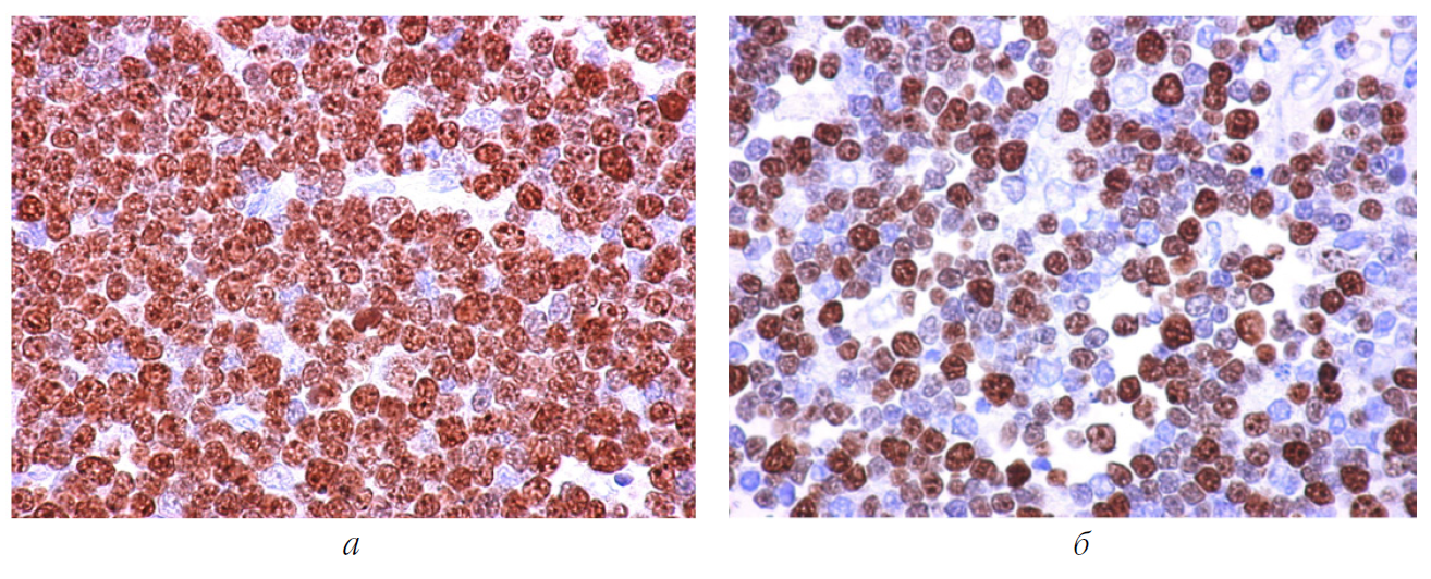 Рис. 1. Экспрессия маркера пролиферации Ki-67 в тимоцитах коркового вещества дольки тимуса: а – группа контроля; б – синий порок ВПС. Ув. ´1000