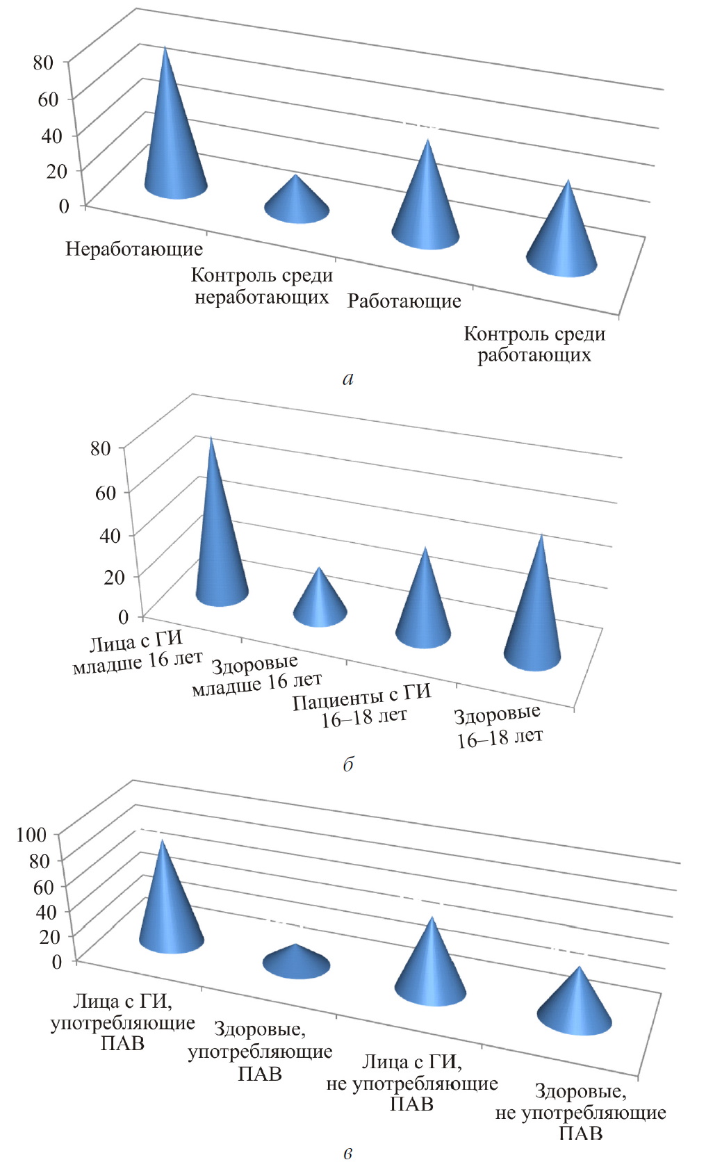 Рис. 1. Случаи заболевания гонореей, %: а – среди работающего и неработающего населения; б – среди лиц, начавших половую жизнь в возрасте менее 16 лет и в 16–18 лет; в – среди лиц, употребляющих и не употребляющих психоактивные вещества