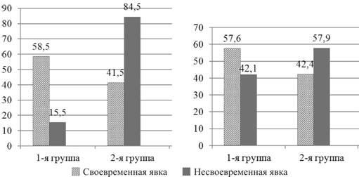 Рис. 2. Доля пациентов, перенесших гонорею, которые: а – явились на диспансерный прием для подтверждения полной элиминации возбудителя после проведенной антибиотикотерапии; б – явились на 14-й день после подтвержденной полной элиминации возбудителя