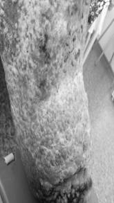 Правая голень значительно увеличена в окружности, отечна, с выраженными явлениями лимфостаза, на фоне которого расположен циркулярно охватывающий очаг поражения неправильной формы с четкими границами, на передней поверхности распространяющийся на область коленного сустава, сзади заканчивающийся в подколенной ямке, переходящий на кожу голеностопного сустава и проксимальных отделов правой стопы, цвета свежего мяса, с опухолевидными узлами диаметром до 1,5 см и папилломатозными разрастаниями тестоватой консистенции, выступающими над уровнем непораженной кожи на 1,0 см. В бороздках между ними определяется значительное количество густого липкого экссудата и мацерация, некоторые ворсинки покрыты плотными гиперкератотическими наслоениями грязно-серого цвета (рис. 1). По периферии очага отмечаются ободок гиперемии с цианотичным оттенком и остаточные явления псориатических высыпаний в виде инфильтрированного участка с чешуйками серебристо-белого цвета на поверхности.