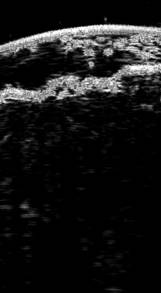 Инструментальные методы. Ультразвуковое высокочастотное исследование кожи: поверхность кожи в зоне патологического очага правой голени (на границе с кожей, свободной от высыпаний) деформирована кнаружи, визуализируются множественные образования эпидермального типа округлой и плоской форм размерами 0,5–1,5 см. Микрорельеф эпидермиса в зоне патологии значительно усилен. Толщина эпидермиса 0,5–0,7 мм. Субэпидермально – анэхогенная зона, без структурных элементов до 0,5 мм. Толщина дермы в проекции элементов 1,5–2,8 мм (на неизмененном участке – 0,6 мм), структура дермы смазана, имеет более низкую эхогенность. Граница дермы с подлежащими тканями имеет размытый характер, не визуализируется нижний контур образований (рис. 2).