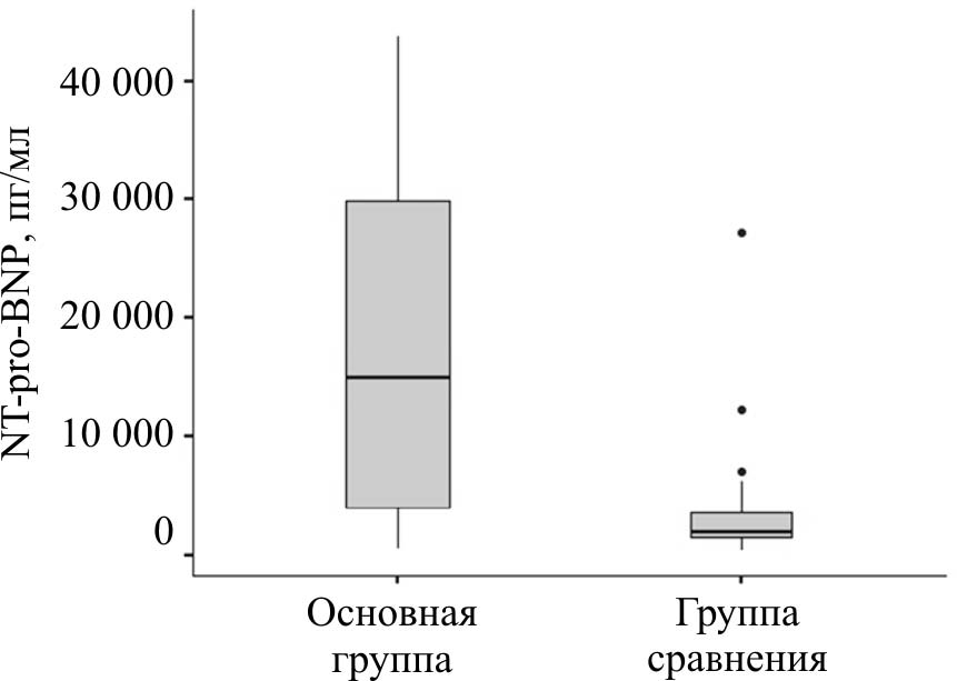 Проведенное всем детям на третий день жизни определение концентрации NT-pro-BNP методом иммуноферментного анализа сыворотки крови позволило установить достоверные различия: в основной группе медиана концентрации для NT-pro-BNP составила 15 000 (Q1–Q3: 4019–29879) пг/мл, в группе сравнения – 1920 (Q1–Q3: 1450–3650) пг/мл, р = 0,001 (рисунок).