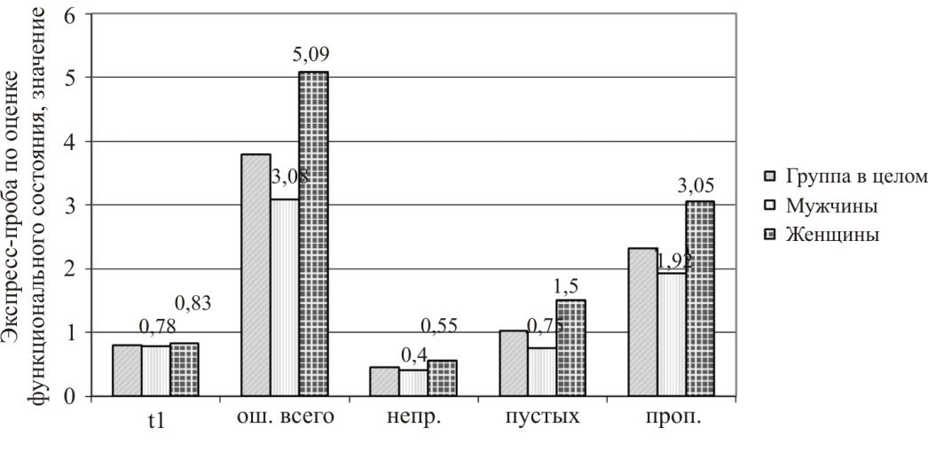 Экспресс-оценка функционального состояния энергодиспетчеров показала, что среднее время реакции на световой стимул меняющегося цвета составило по группе в целом 0,8 ± 0,03 с, незначительно отличаясь у мужчин и женщин, тогда как число допущенных ошибок при выполнении задания указывало на то, что степень утомления несколько превышала верхнюю границу нормы, свидетельствуя о наличии хронического утомления, состояния дистресса и других неблагоприятных изменений функционального состояния у работников (рис. 1) при отсутствии значимых корреляционных зависимостей от возраста и стажа работы. При этом на высокую степень утомления и снижение работоспособности указывает то, что ошибочные действия нарастали за счет количества пропущенных сигналов, тогда как число реакций на сигнал не заданного цвета было минимальным, а в отсутствие сигнала – крайне незначительным. Также заслуживает внимания то, что у женщин-энергодиспетчеров общее число ошибок составило 5,1 ± 0,79, тогда как у мужчин оно практически почти не превышало верхнюю границу нормы (3,1 ± 0,5). По-видимому, эти данные указывают, скорее всего, на более глубокие проявления профессионального стресса, приводящего к снижению работоспособности и качества выполнения работы у женщин-энергодиспетчеров, что реализуется в статистически достоверных различиях в числе ошибок у мужчин и женщин (p < 0,05).