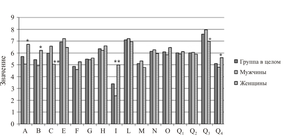 Рис. 2. Результаты оценки личностных характеристик энергодиспетчеров по опроснику Кеттелла: шкалы: А (общительность); В (интеллектуальность); С (эмоциональная устойчивость); Е (доминантность); F (беспечность); G (моральная нормативность); H (смелость); I (эмоциональная чувствительность); L (подозрительность); M (мечтательность); N (проницательность); O (тревожность); Q1 (восприимчивость нового); Q2 (самостоятельность); Q3 (самодисциплина); Q4 (напряженность). Условные обозначения: достоверность различий между группами мужчин и женщин: * p < 0,05; ** p < 0,01