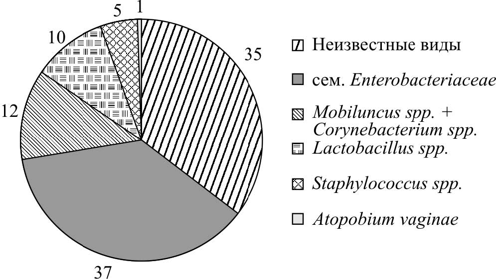 Большинство микроорганизмов в околоплодных водах выявлены в единичных случаях и крайне низких титрах: Lacto bacillus spp., Staphylococcus spp., Mobiluncus spp. + Corynebacterium spp. и Atopobium vaginae (рисунок).
