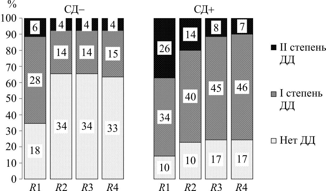 Наши результаты по преимуществу использования ТМД в диагностике ДД ЛЖ совпадают с данными E. Febe еt al. (2012). В это исследование были включены 40 пациентов, страдающие диабетом, и 20 добровольцев в качестве контрольной группы. Всем была выполнена традиционная эхокардиография с помощью ИВД и тканевое допплеровское изображение. У 55 % пациентов с СД 2-го типа и у 10 % обследуемых из контрольной группы была выявлена ДД (p = 0,001).