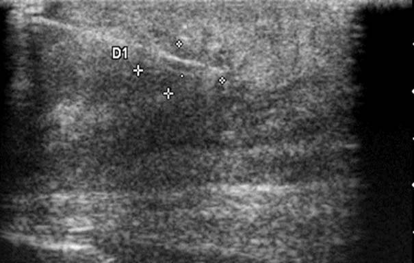Рис. 1. Сонограмма копчикового хода. Месторасположение иглы (D1) и световода указано крестиками