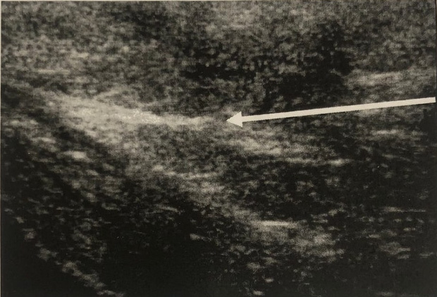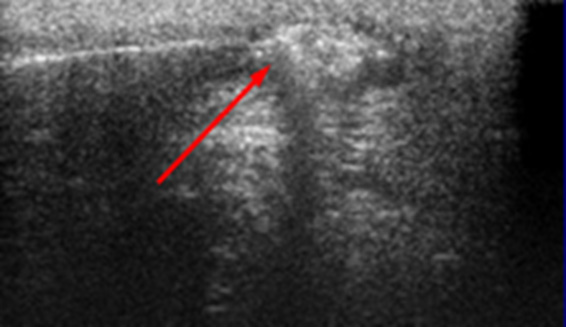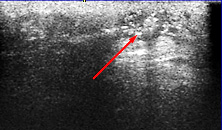 Рис. 3. Сонограмма крестцово-копчиковой области пациента через месяц после лазерной облитерации кисты. Стрелкой указан соединительнотканный рубец на месте бывшей полости