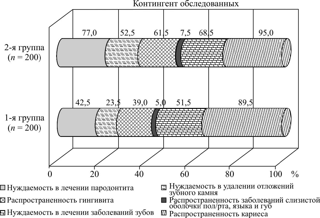 Нуждаемость в лечении воспалительных заболеваний пародонта средней и тяжелой степени в основной группе оказалась примерно в 1,5 раза выше, чем в контрольной (77,0 ± 2,98 против 42,5 ± 3,50 %, р < 0,001), а по гингивиту почти в 2 раза выше (61,5 ± 3,44 против 39,0 ± 3,45 %, р < 0,001) (рис. 1).