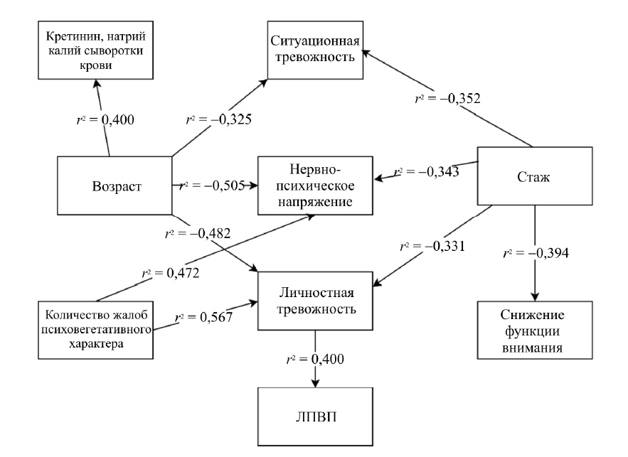 В ходе корреляционного анализа во II группе установлено: умеренная отрицательная корреляция между возрастом и индексом НПН (r2 = –0,5; р < 0,05), личностной тревожностью (r2 = –0,5; р < 0,05), умеренная отрицательная корреляция между стажем и снижением ФВ (r2 = –0,4; р < 0,05), индексом НПН (r2 = –0,3; р < 0,05), личностной тревожностью (r2 = –0,3; р < 0,05). Имеется корреляция между личностной тревожностью и повышением ЛПВП (r2 = 0,4; р < 0,05). Кроме того, умеренную корреляцию имеют индекс атерогенности и ТМЖП (r2 = 0,5; р < 0,05) (рис. 2). Согласно приведенным данным, у работников с увеличением стажа более 20 лет прекращает нарастать НПН, связь становится обратной, что отражает достижение «предельного» уровня напряжения симпатической нервной системы и тенденции к декомпенсации.
