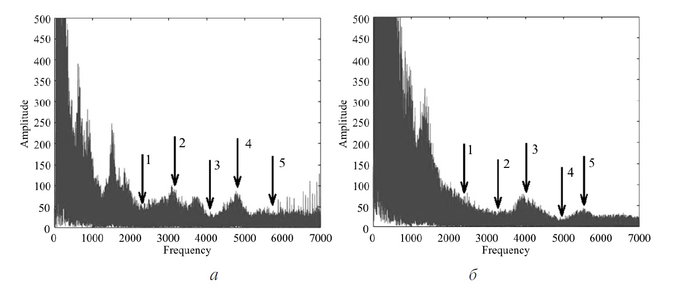 Рис. 1. Спектры FFT здорового добровольца (а) и пациента с COVID-19 (б); амплитуды даются в произвольных единицах