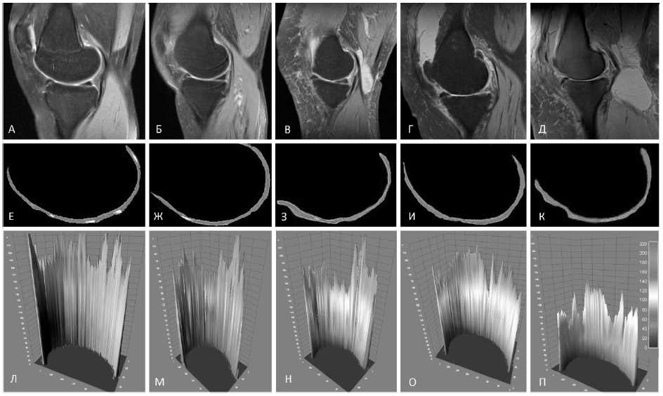 Рис. Сегментация PDFS-взвешенных магнитно-резонансных томограмм и спектры протонной плотности суставного хряща: фрагменты А–Д – МРТ коленного сустава в области медиального мыщелка бедренной кости; фрагменты Е–К – сегментация изображений суставного хряща; фрагменты Л–П – спектры протонной плотности; фрагменты А–Л соответствуют норме, Б–М – I стадия ОА, В–Н – II стадия ОА; Г–О – III стадия ОА; Д–П – IV стадия ОА
