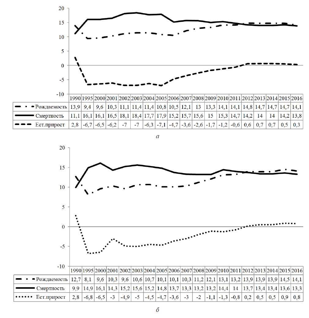 Рис. 1. Динамика показателей рождаемости, смертности и естественного прироста за 1990–2016 гг. на 1000 человек населения: а – по ПК; б – по г. Перми