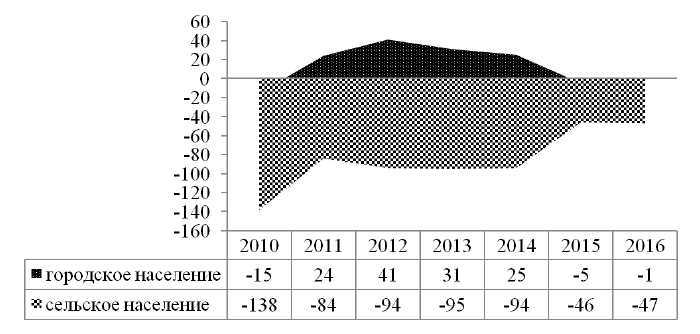 Динамика миграционного прироста как г. Перми, так и ПК неоднородна (табл. 3, рис. 2). В 2010 г. отмечался высокий уровень миграции как городского населения, так и сельского. Уже в 2011 г. городское население увеличилось на 64 %. Впоследствии эта тенденция сохранилась. Миграционная убыль сельского населения продолжает уменьшаться, разница между 2010 и 2016 гг. составила 66 %. Интересный факт, что в 2013 г. уровень миграционного прироста в ПК составил всего 22 человека. Это объясняется тем, что в этот год практически сравнялись уровни миграционного прироста городского населения и убыли сельского. Население края меняет место жительства на другие регионы страны: Центральный, Уральский, Северо-Западный и Южный федеральные округа. В 2016 г. особое предпочтение жители края отдали городу Москве и Московской области (миграционный отток составил 559 человек), Свердловской области (403 человека), Краснодарскому краю (306 человек), Санкт-Петербургу и Ленинградской области (305 человек), а также Тюменской области (198 человек). В свою очередь, население Пермского края пополняется мигрантами из стран ближнего зарубежья, в первую очередь из Таджикистана, Узбекистана, Азербайджана и Кыргызстана.
