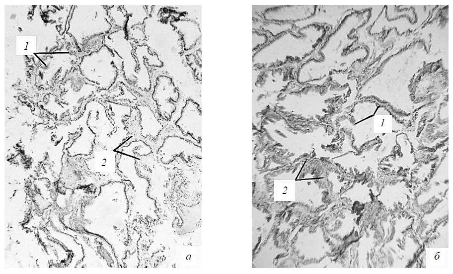 Рис. 1. Участок предстательной железы животных репродуктивного возраста на 15-е сутки наблюдения: а – после применения циклофосфамида; б – в контроле; 1 – эпителий желез; 2 – соединительная ткань. Окраска гематоксилин-эозином. Увеличение: приближение – zoom 18,5; объектив – PlanCN 10x/0,25 ∞/-/FN22