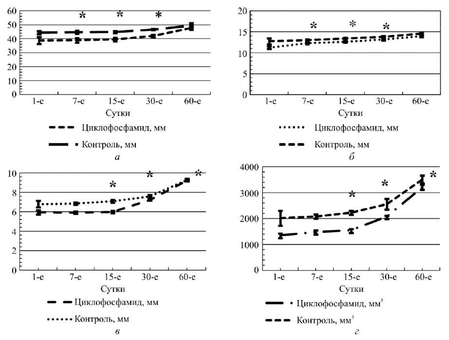 Рис. 2. Изменения длины (а), ширины (б), толщины (в) и объема (г) предстательной железы после применения циклофосфамида и в контроле; * – достоверное отличие от контрольных данных (p < 0,05)