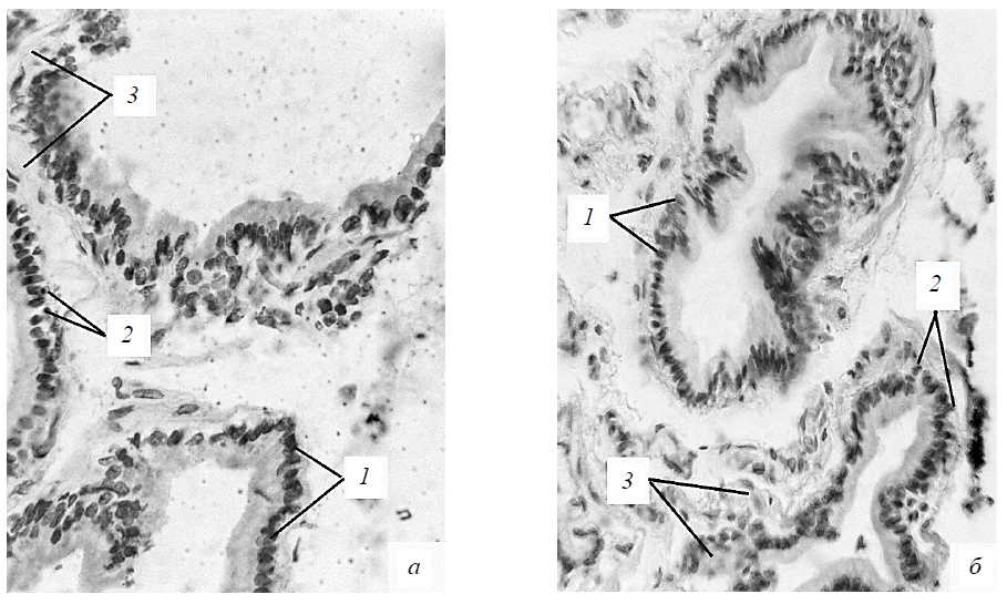 Рис. 3. Участок предстательной железы неполовозрелых крыс на 15-е сутки наблюдения: а – после применения циклофосфамида; б – в контроле; 1 – ядра секреторных эпителиоцитов; 2 – базальные клетки; 3 – соединительная ткань. Окраска гематоксилин-эозином. Увеличение: приближение – zoom 18,5; объектив – Plan CN40x/0.65 ∞/0.17/FN22
