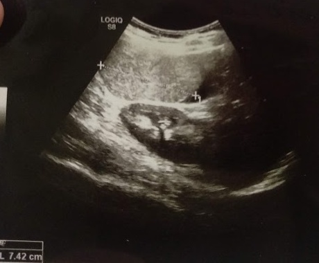 Рис. 2. Ультразвуковое изображение капиллярной гемангиомы правой доли печени. Эллипсоидной формы образование повышенной эхогенности с четкими контурами с мелкосетчатым структурным рисунком