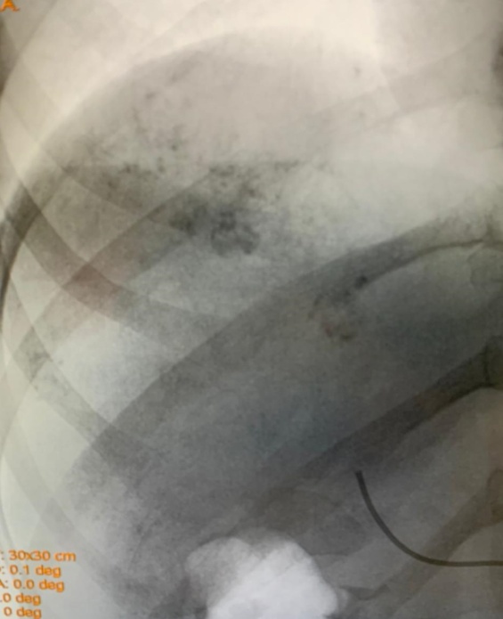 Рис. 3. Гемангиома правой доли печени. Состояние после РЭО ветвей правой печеночной артерии. Интраоперационное фото