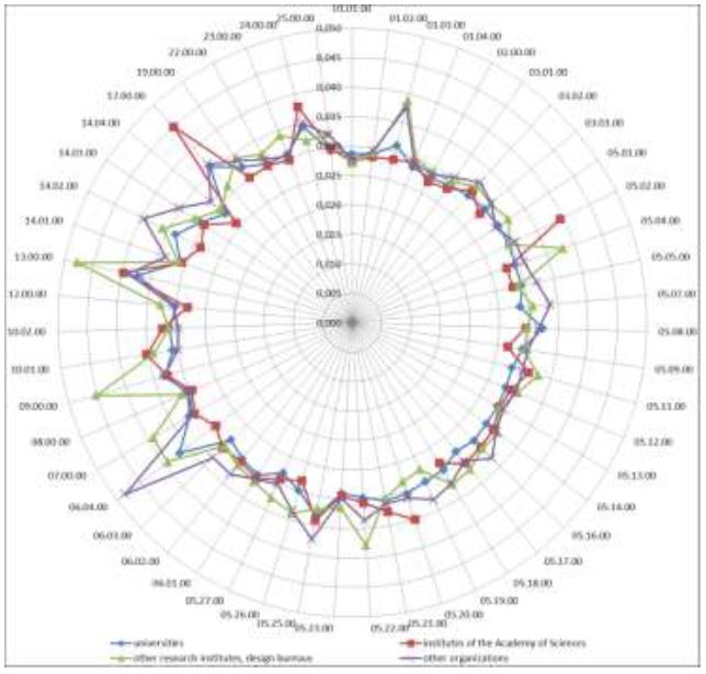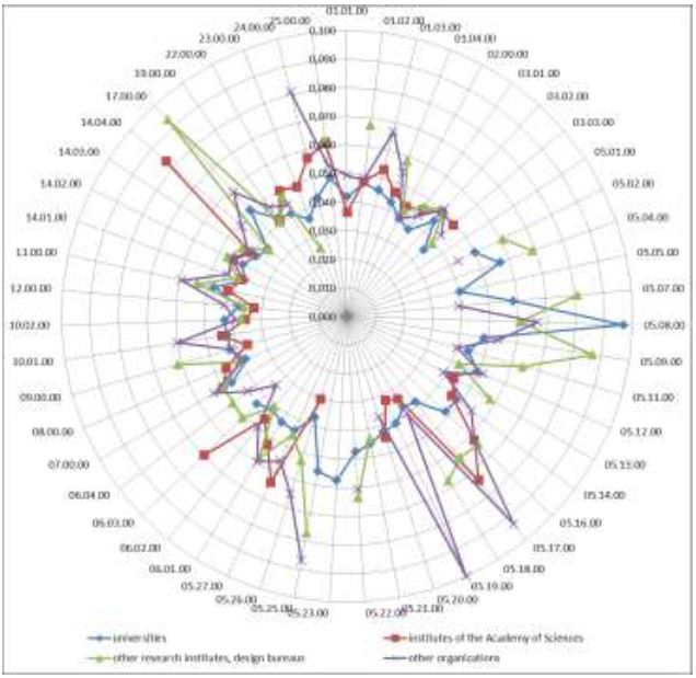 Fig. 1 and 2 show the values of rotation coefficients for candidates and doctors of sciences in the context of groups of scientific specialties and sectors of the economy: universities, institutes of the Academy of Sciences, other research institutes, design bureaus, and other organizations.