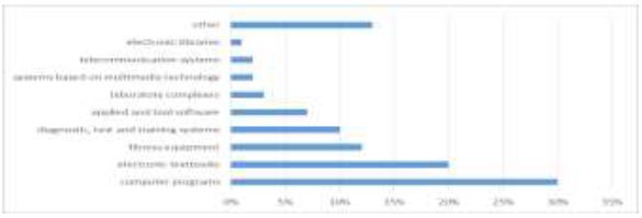 One of the main directions in the field of education is access to computer programs, which is over 30%, electronic textbooks are on the second place, whose figure is about 20%, and third place is virtual simulators, with an indicator of 12%.