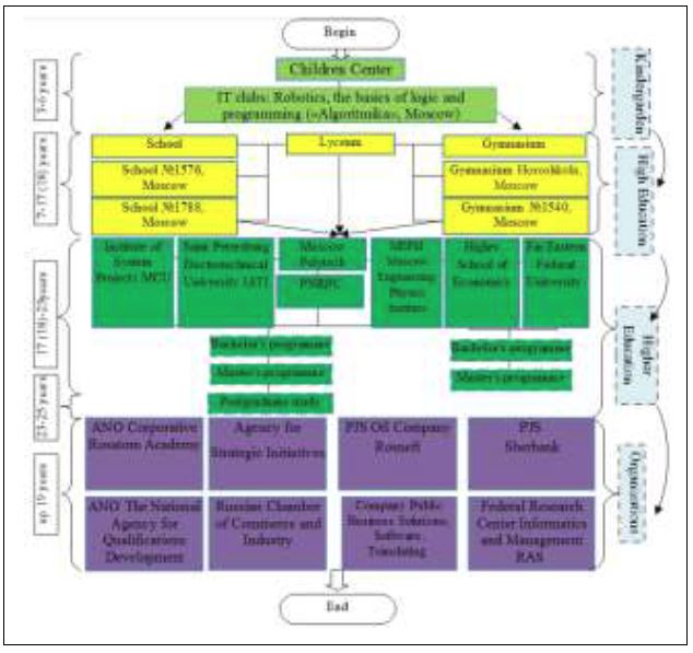 Notable is that there is no stage of a vocational education, namely training at colleges and technical schools in the scheme, which, firstly, negatively affects the entire education and training system in the digital segment and, secondly, these graduates cannot acquire decent knowledge as IT-staff taking into account up to date and onrush technologies. The curricula of colleges and technical schools contain only basic disciplines related to information and communication technologies. The same problem is noted at the level of school education: it is significant for the most schools with the exception of specialized secondary education institutions shown in the diagram (see Fig. 1) where the students of primary classes obtain optional lessons related to new IT technologies and licensed software. These schools are attracting leading university employees to deliver the IT-subjects to high school students. A positive determinant of the lack of a level of a vocational education in a personnel elevator can only be the authorities' desire to stimulate high school graduates to enter the country's leading engineering universities.