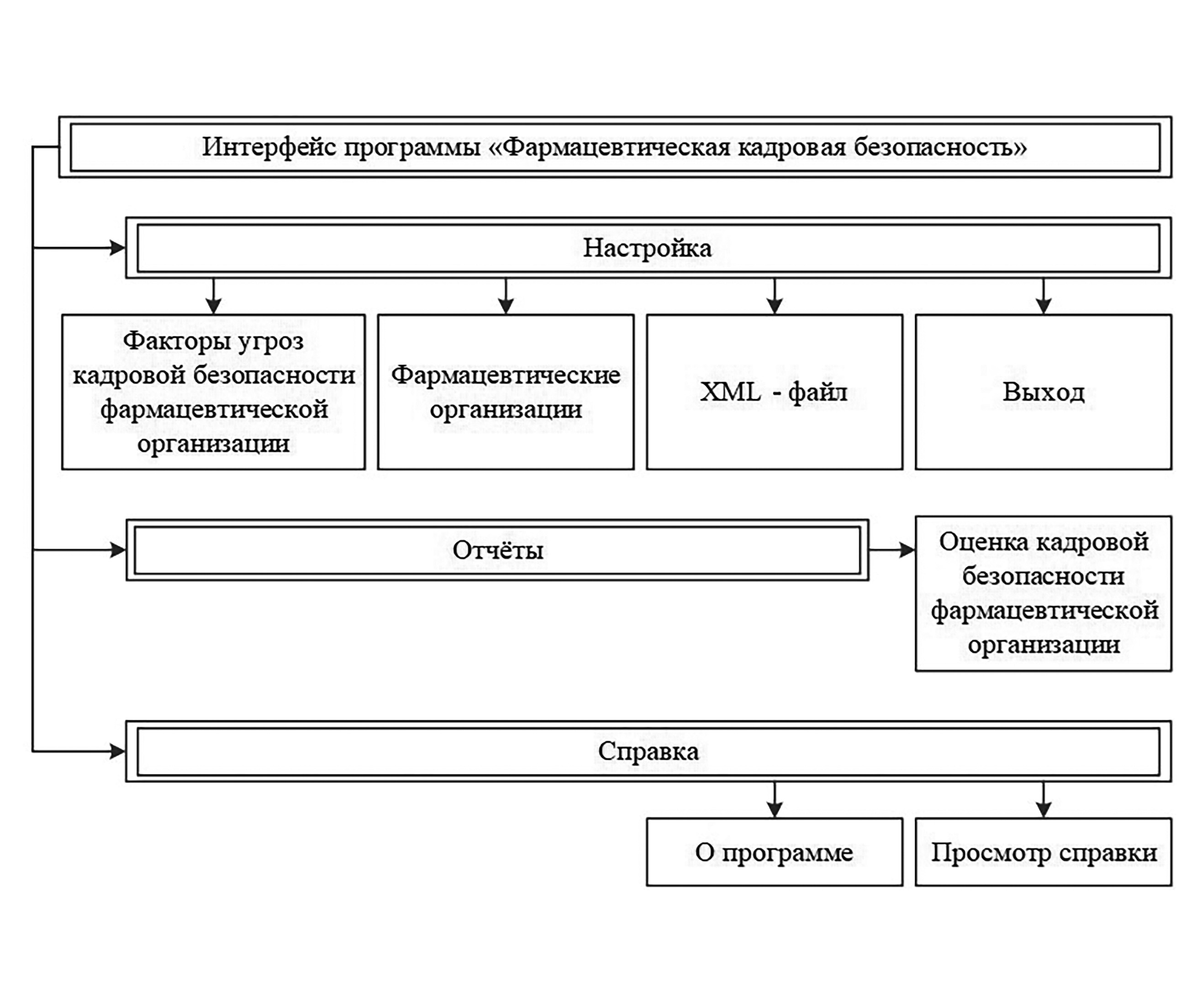 Основной проблемой обеспечения фармацевтической кадровой безопасности является то, что данный ресурс отличается максимальной непредсказуемостью, что обязывает руководителей фармацевтических организаций более тщательно продумывать собственную политику и систему управления в этой сфере [6–8]. Для этой цели необходимо наиболее полно и точно оценить состояние кадровой безопасности в настоящий момент, чтобы принять наиболее точные и правильные управленческие решения [9]. Однако такой анализ является длительным и трудоемким процессом, представляющим собой комплекс мероприятий организационного, экономического и технического характера. Для облегчения и оптимизации этого процесса, а также экономии времени на обеспечение оптимального уровня кадровой безопасности нами разработан и предложен программный продукт «Фармацевтическая кадровая безопасность». Данная программа представляет собой комплекс программных средств, которые позволяют конечному пользователю с помощью ЭВМ оценить, проанализировать и смоделировать состояние кадровой безопасности в фармацевтических организациях [10–12].