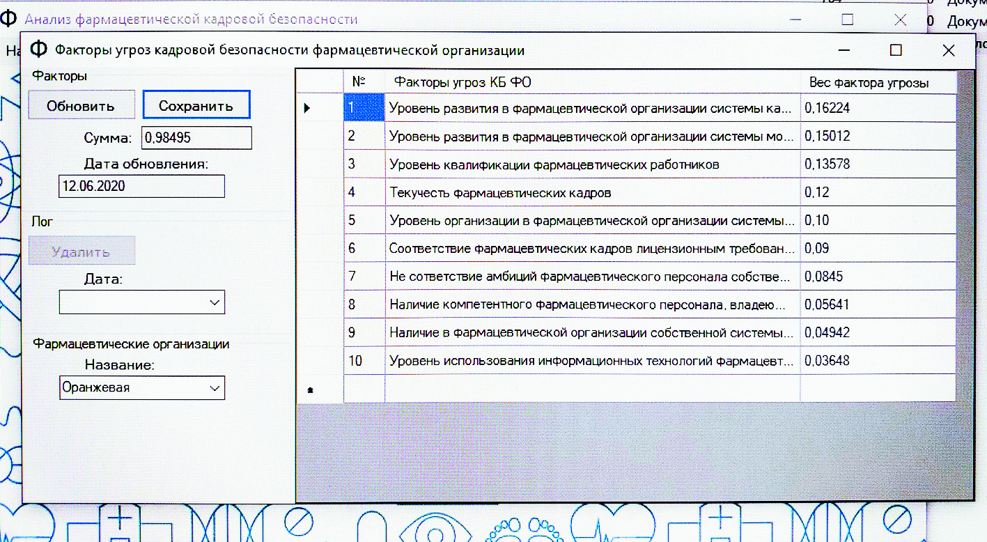 Для оптимизации процессов расчета факторов угроз КБ ФО нами был разработан методологический подход по анализу факторов угроз кадровой безопасности с помощью программы для ЭВМ «Фармацевтическая кадровая безопасность». В основе разработанной программы используется экономико-математическая модель, которая описывает этапы анализа и оценки состояния кадровой безопасности фармацевтических организаций.