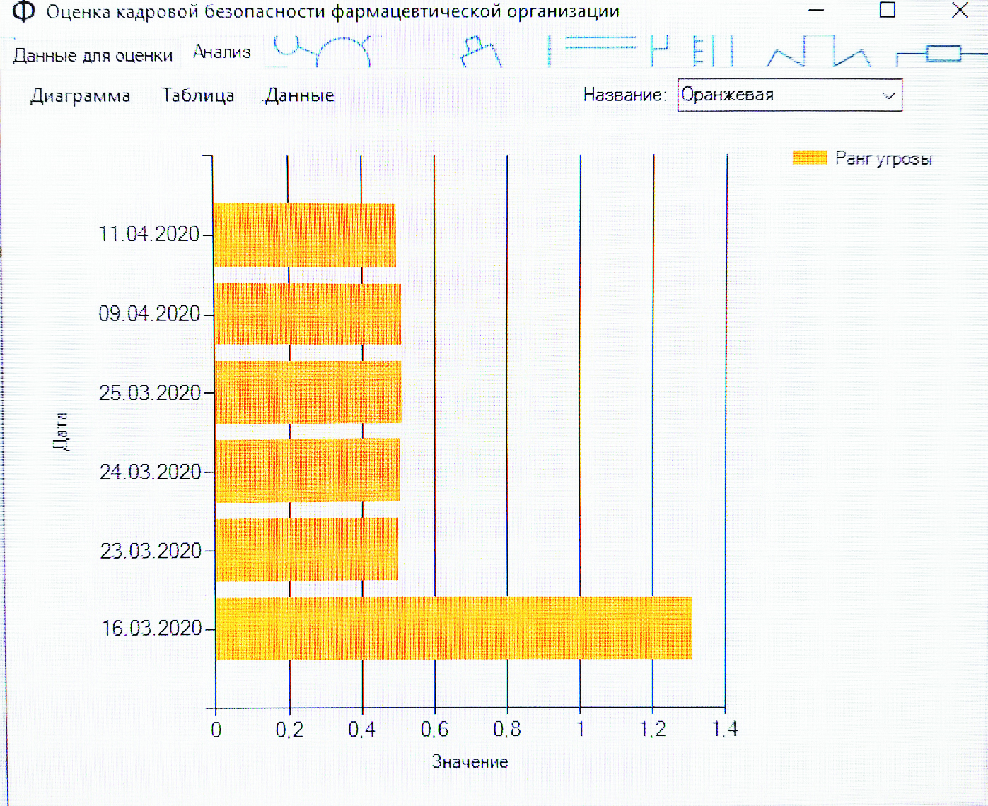Результат анализа фармацевтической кадровой безопасности можно просмотреть в виде таблицы или диаграммы. При этом программа позволяет выбрать наиболее удобный для конкретного пользователя тип диаграммы: упрощенная точечная, пузырьковая, лепестковая, ступенчатый график, линейчатая диаграмма диапазона, гистограмма диапазона, «японские свечи» или блочная; также можно выбрать оптимальный цвет. Данные в таблице или диаграмме будут представлены в зависимости от даты исследования, что является особенно удобным при анализе состояния кадровой безопасности в динамике (рис. 4–7).