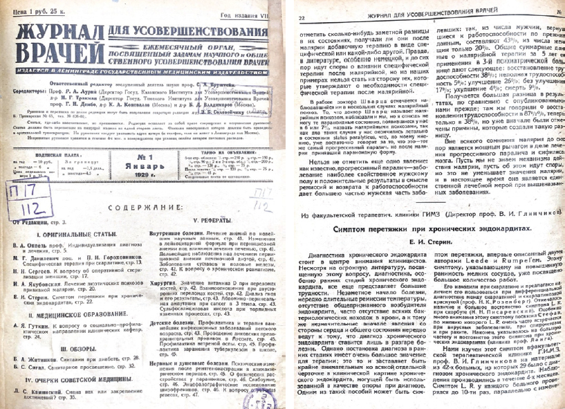 Рис. 3. Журнал для усовершенствования врачей – номер 1 от января 1929 года, где была опубликована первая статья И. А. Стерина / Fig. 3. Journal for Advanced Training of Doctors – number 1 of January 1929, where the first article by I. A. Sterin was published