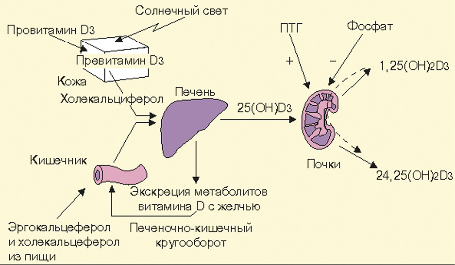 Рис. 2. Схема поступления в организм, образования в коже и экскреции холекальциферола, 25(ОН)D3 и его активных метаболитов, образующихся в почках (активного гормона 1,25 (ОН)2D и неактивных субстанций 24,25 (ОН)2D)
