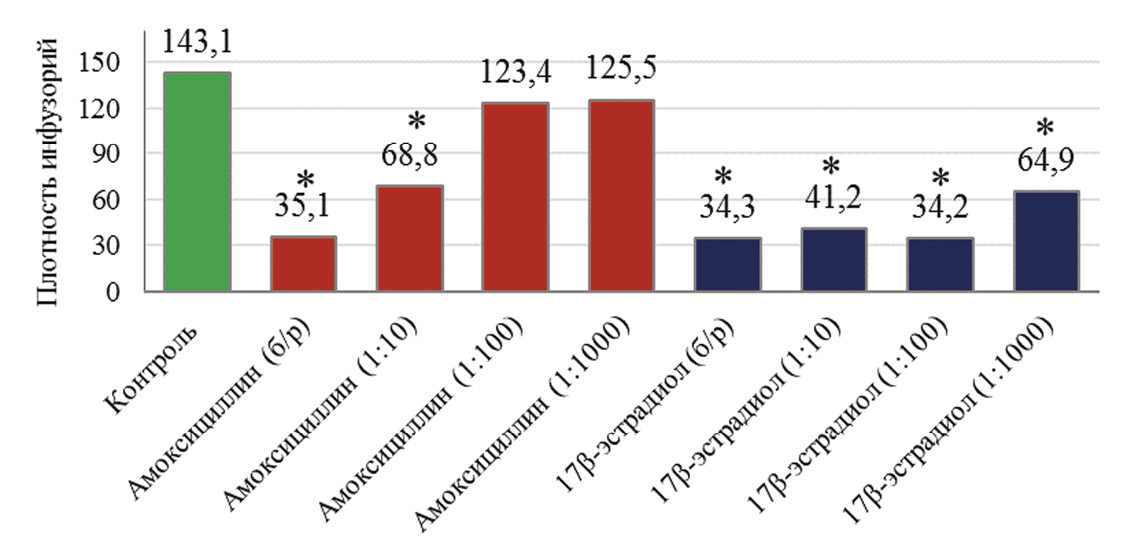 Рис. 1. Результаты изменения плотности инфузорий Paramecium caudatum в растворах амоксициллина в диапазоне доз от 0,000078 мг/л до 0,000000078 мг/л и 17β-эстрадиола в диапазоне доз от 0,00001мг/л до 0,00000001 мг/л. Примечание: *значимые отличия от фоновых значений, при p<0,05