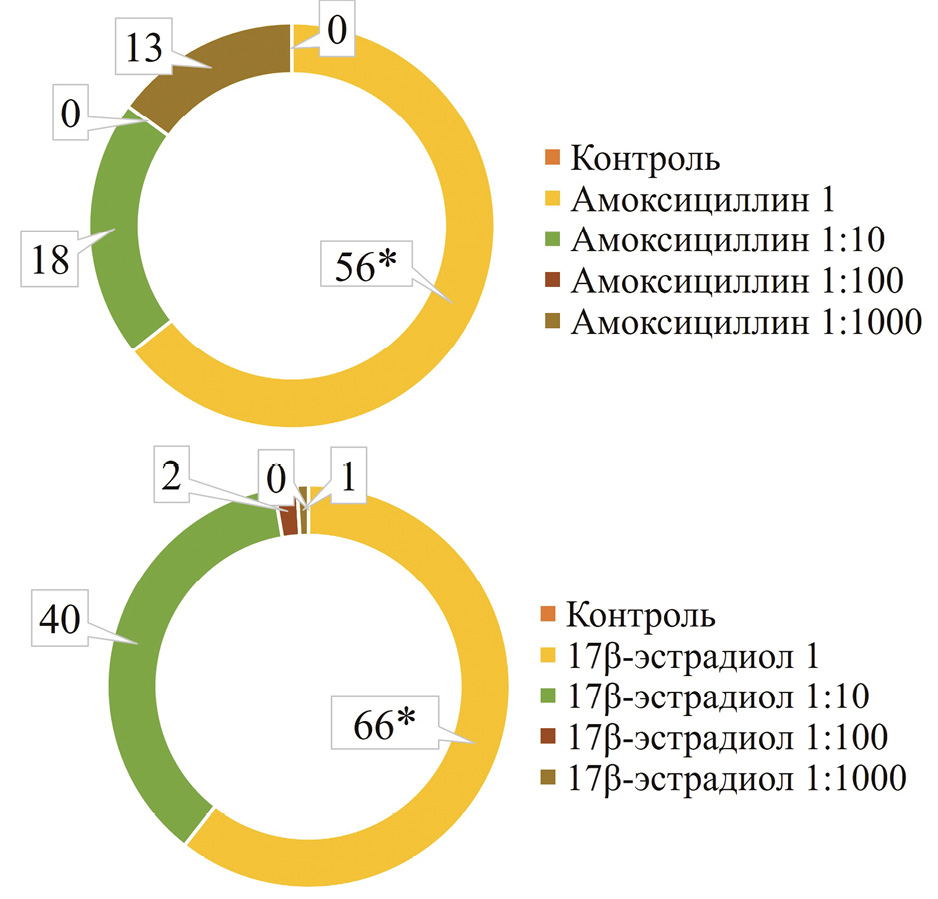 Этот эффект снижался при уменьшении концентрации исследуемых растворов. Однако 17β-эстрадиол в концентрации 0,000001мг/л (разбавление 1:10) все еще оказывал токсическое действие. Рост хлореллы при этом увеличился на 40% по отношению к контрольным значения. Данные результаты свидетельствуют о том, что гормоны обладают более высоким токсическим действием на зеленые водоросли, чем антибиотики. Однако амоксициллин является не менее токсичным фармполлютантам на эти таксоны, что подтверждается высоким процентом роста водорослей под их воздействием. Концентрации ниже ПДК амоксициллина (0,0000078 мг/л (кратность разбавления 1:10)) не оказывали токсического действия, что, вероятно, связано со свойствами антибиотика, таких как электрофильность, стабильность и гидрофобность.