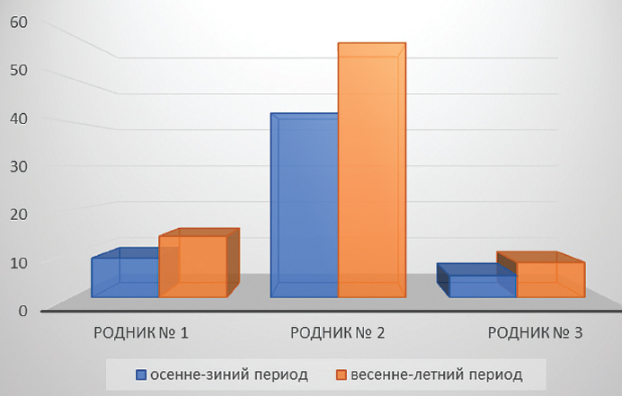 В таблице 1 представлены результаты исследования общего количества микроорганизмов в воде подземных источников, определенного в воде за период 2021–2022 годов по сезонам года.