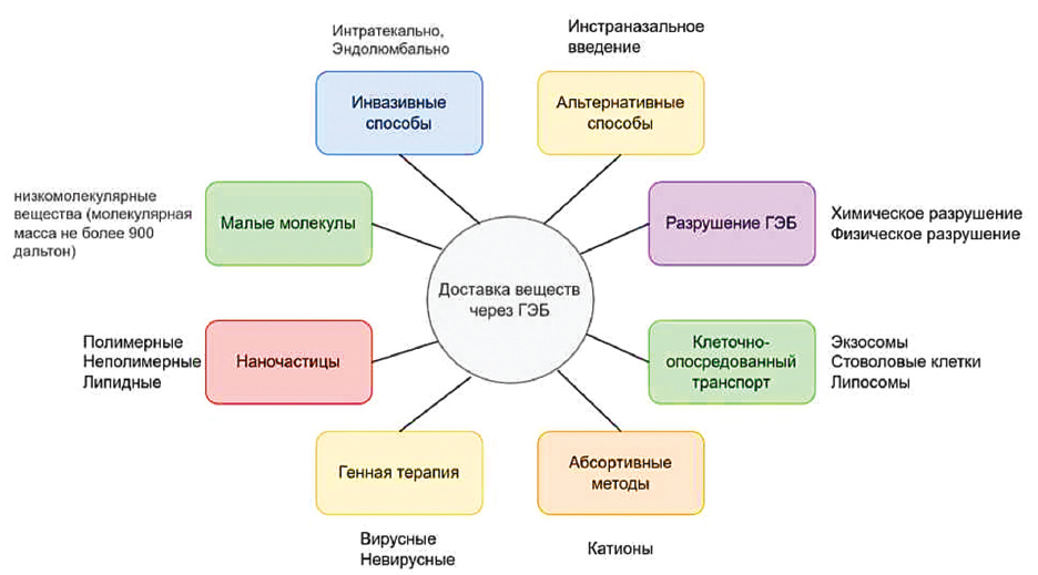 Рис. 1. Способы доставки веществ через гематоэнцефалический барьер / Fig. 1. Methods of drug delivery through the blood-brain barrier