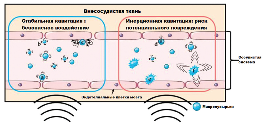 Выраженность нарушений структуры и функции ГЭБ в значительной степени зависело от параметров ультразвука. При использовании повышенной мощности ультразвуковых волн на головной мозг отмечались: точечный выхода эритроцитов за пределы стенки микрососудов (экстравазации), внутримозговые кровоизлияния, а также грубые повреждения мозговой ткани (отек, гибель нейронов и др.) [11, 12]. Основным патогенетическим фактором повреждающего действия ультразвука было образование в жидких средах мозга большого количества нестабильных микропузырьков. В результате нестабильной кавитации (иннерционной) микропузырьки интенсивно разрушаются («взрываются»), оказывая механическое воздействие на эндотелий микрососудов (экстравазация) жидкой части крови, повреждение мембран эритроцитов и лейкоцитов в микрососудах мозга. В связи с относительной безопасностью ультразвуковой технологии повышения проницаемости ГЭБ для ЛС этот подход дальнейшего развития пока не получил [5].