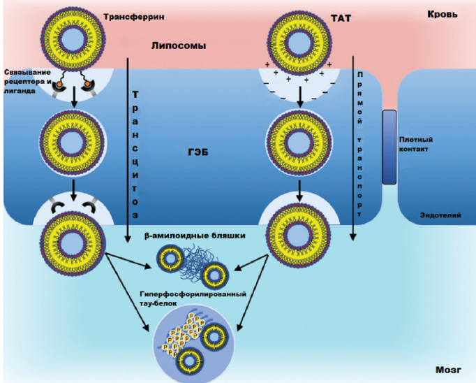 В настоящее время установлено два механизма преодоления ГЭБ – клеточно-опосредованный трансцитоз и прямое проникновение (Рис. 5). При клеточно-опосредованном трансцитозе липосома связывается рецептором, затем происходит ее интернализация и проникновение в мозг. Ведущая роль в процессе интернализации (внедрения) липосом принадлежит пептидам, проникающим в клетку положительно заряженным аминокислотам, обеспечивающим эндоцитоз за счет взаимодействия с отрицательно заряженной мембраной эндотелиальных клеток. Оказавшись в головном мозге, многофункциональные липосомы могут быть направлены на соответствующую мишень (например, белок тау или амилоиды при болезни Альцгеймера).