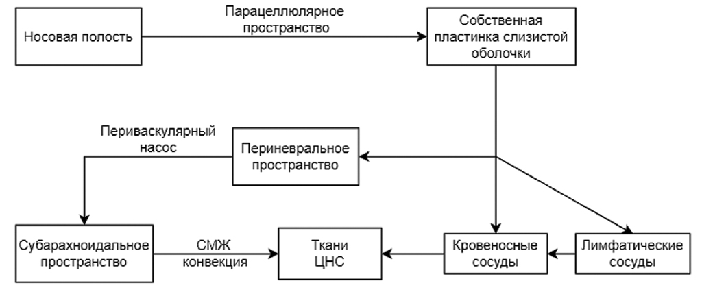 Рис. 6. Внеклеточный механизм доставки веществ при интраназальном введении / Fig. 6. Extracellular mechanism of drug delivery during intranasal administration