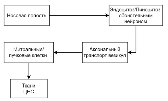 Единой точки зрения ученых о путях и механизмах доставки лекарств в ЦНС при ИН введении препаратов не сложилось. Вместе с тем, в литературе появляются факты, которые свидетельствуют, что волокна, иннервирующие слизистую носа, могут участвовать в доставке полисахаридов и белков в структуры ЦНС при их интраназальном введении. В экспериментах на мелких лабораторных животных J. J. Lochhead et. al. [30], сравнили интенсивность проникновения декстрана (3 кДа) с иммунофлуоресцентной меткой в ЦНС при интраназальном и внутриартериальном введении полисахарида. Показано, что после интраназального введения течение 20 мин метка декстрана выявлялась в периваскулярном пространстве мозга у 80% животных. Наиболее значительная флуоресценция обнаружена на вентральной и латеральной поверхностях головного мозга, в том числе в точках входа обонятельных (обонятельная луковица) и тройничного (мост) нервов. Флюоресцентного сигнала на поверхности головного мозга после внутриартериального введения меченого полисахарида выявлено не было [30]. Схожие результаты были получены при исследовании распределения белков, меченных I125, в ЦНС после ИН введения в экспериментах на крысах и обезьянах. Метки белков обнаруживались в окончаниях волокон обонятельного и тройничного нервов эпителиальной выстилки носа, а также в структурах обонятельной луковицы и ствола головного мозга [31].