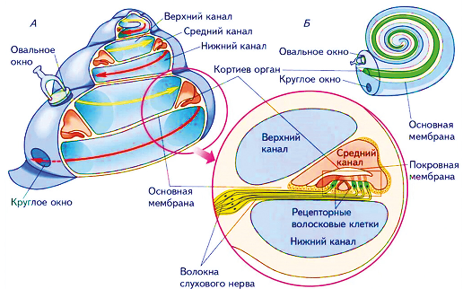 Рис. 4. Строение улитки. А – улитка; Б – поперечный разрез каналов / Fig. 4. The structure of the cochlea. А – snail; Б – cross section of channels