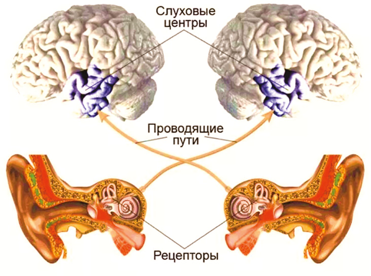 От рецепторных клеток электрические импульсы по слуховому нерву направляются в кору головного мозга (рис.6). Центры первичной слуховой коры формируют способность человека локализовать звук и определять направление его смещения (пространственный слух), а также воспроизводить простые звуковые образы. Ассоциативные зоны слуховой коры головного мозга ответственны за распознавание значений слышимых слов (рис. 6).