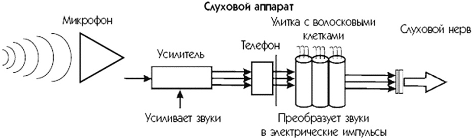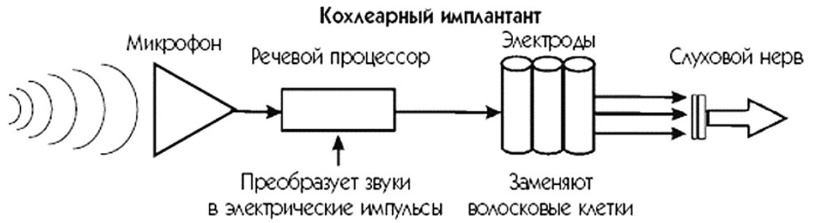 Кохлеарный имплант состоит из внутренней и внешней части. Внутреннюю часть хирург вживляет в ухо глухого пациента. Внешняя часть с процессором располагается на ухе и/или голове пациента. Она улавливает звуки, речь и передает их через кожу головы во внутреннюю часть. Импульсы, стимулируя слуховые нервы, а те, в свою очередь, передают полученные сигналы в мозг, который преобразует их в звуки. Пациент их слышит сразу же, как только они появляются (рис. 22).