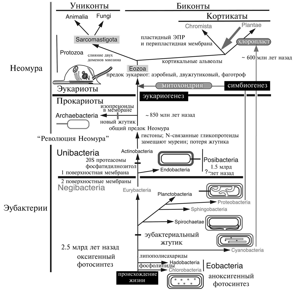 Рис. 2. Диверсификация типов прокариотных клеток и главный рубеж живого – прокариоты/эукариоты – по Кавалье-Смиту [9]. Серой вертикальной линией обозначена неформальная (не филогенетическая) группировка «неомура», стрелками – прямая фи-лиация таксонов и органелл (симбиогенез), поперечными засечками – основные ароморфозы в эволюции прокариот и эукариот / Fig. 2. Diversification of cell body plans of prokaryotic cells and the main life boundary (prokaryotes/eukaryotes) according to Cavalier-Smith [9]. The gray vertical line indicates an informal (non-phylogenetic) “neomura” grouping, the arrows indicate the direct phyliation of taxa and organelles (symbiogenesis), and the cross-strokes indicate the main progressive events in evolution