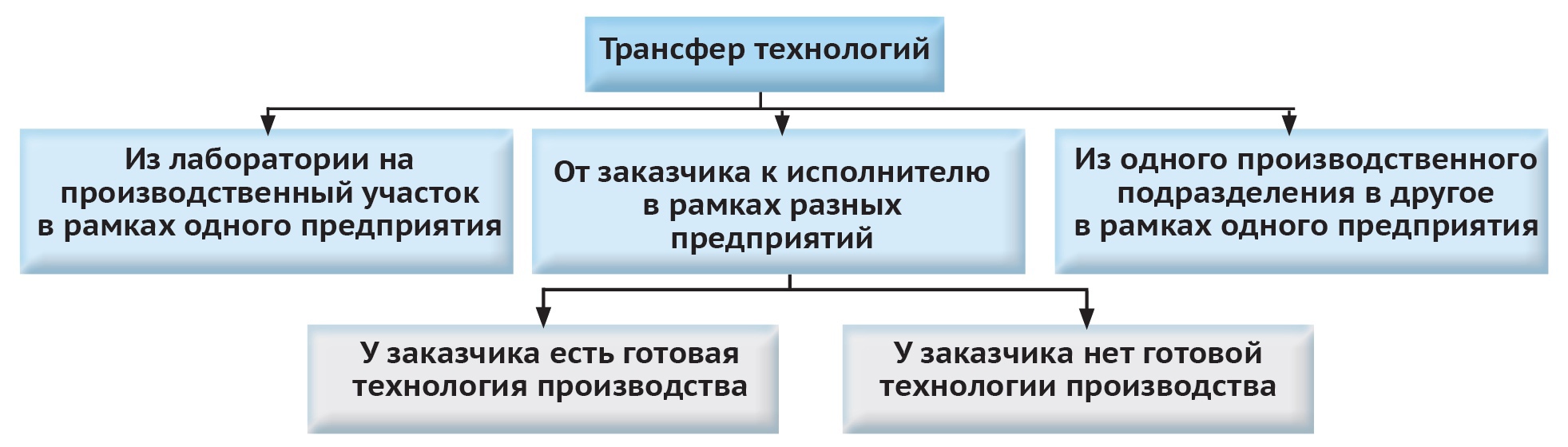 В мировой практике выделяется ряд видов трансфера технологий. Мы взяли за основу те виды трансфера технологий, которые могут встречаться при подготовке нового лекарственного препарата на производственной площадке производителя лекарственных средств. Они изображены на рис. 1.