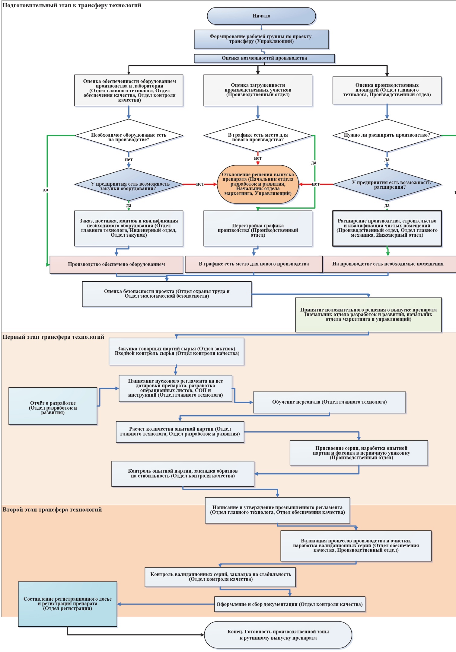 Осуществление трансфера технологий в организации представителями группы трансфера технологии начинается после передачи отчета о разработке препарата [3, 10] в отдел главного технолога, занимающегося разработкой пускового регламента – технологического документа, на основании которого осуществляют ввод в эксплуатацию и освоение вновь созданного промышленного производства [11].