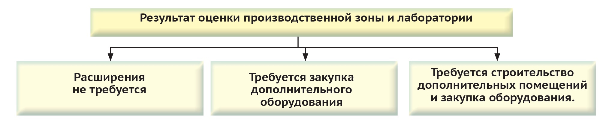 Проводится оценка производственной и лабораторной зоны на предмет обеспечения требуемых параметров процессов производства и контроля качества и оценку безопасности проекта трансфера технологии. В результате данной оценки деятельность предприятия может развиваться по трем направлениям, представленным на рис. 3.