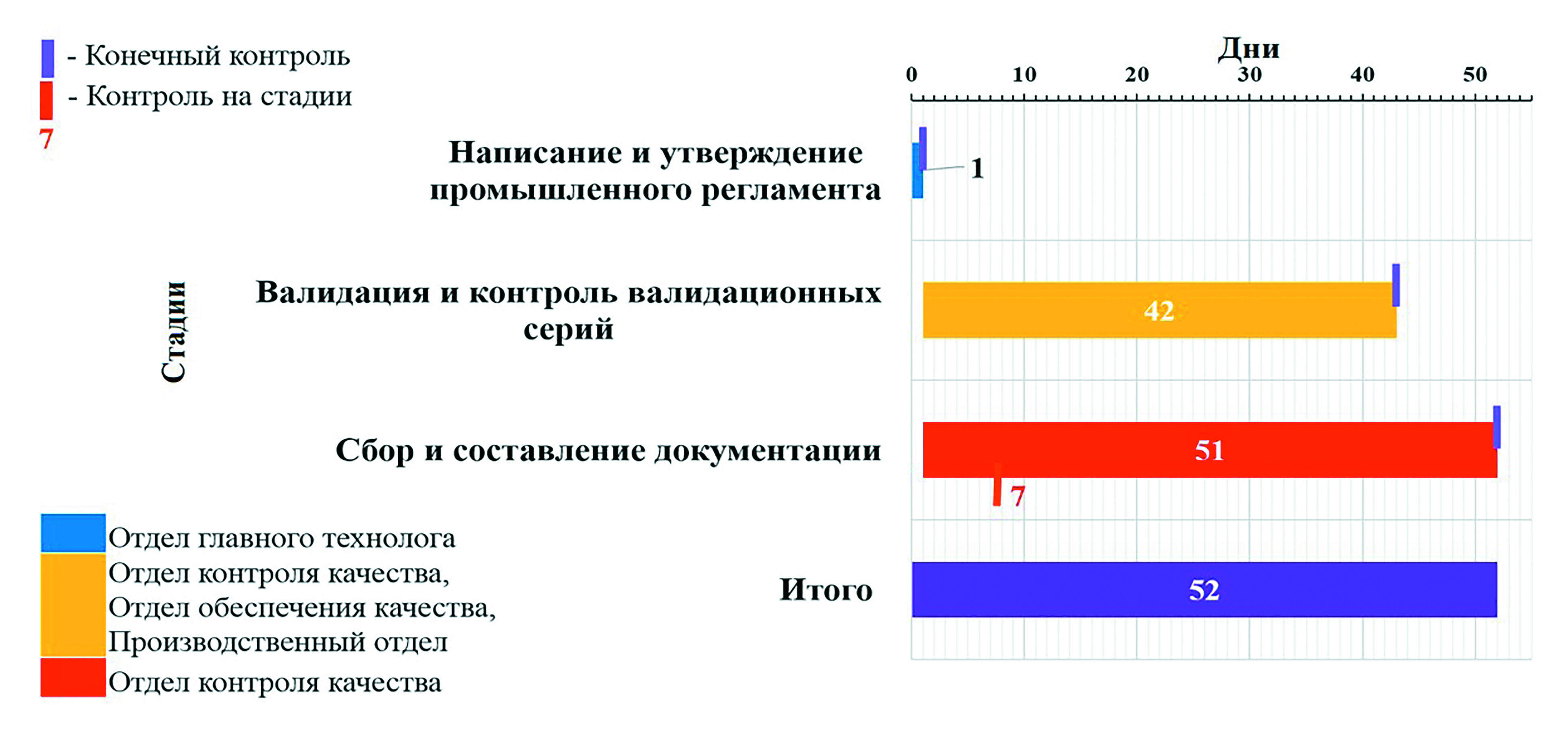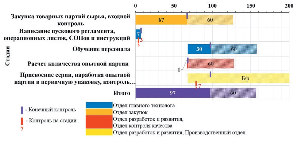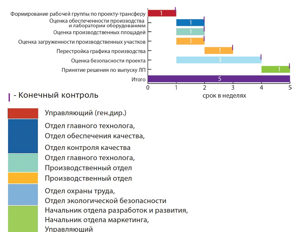 Чтобы подтвердить правильность и качество переноса технологии из лаборатории на производство и качество выпускаемого продукта, необходимо контролировать весь процесс трансфера технологии во всех задействованных подразделениях. Для осуществления контроля деятельности и расчета времени на этапах при построении диаграммы было определено несколько контрольных точек.