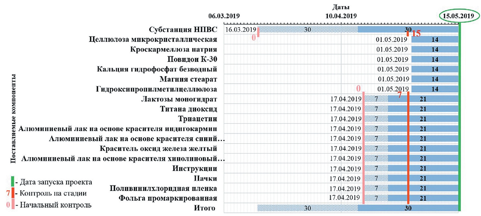 Таким образом, чтобы обеспечить наличие сырья в организации к определенной дате и организовать деятельность без простоя, требуется осуществлять заказ субстанции и вспомогательных веществ в разное время и учитывать возможные задержки поставки. Для осуществления поставленной задачи была разработана временная диаграмма планирования заказа сырья, представленная на рис. 9.