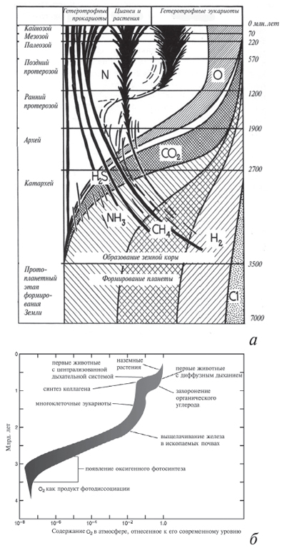 Fig. 1. Evolution of Earth’s atmosphere composition (a) and an increase of the oxygen content (б) [2, 3]