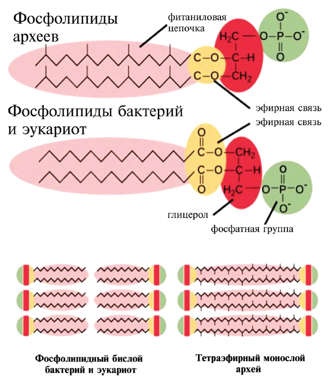 Как уже было упомянуто, структура плазматической мембраны архей специфична. Вместо неразветвленных жирных кислот, свойственных мембранным липидам бактерий и эукариот, у архей обнаружены разветвленные изопреновые цепи, а фосфолипиды располагаются в виде монослоев, соединенных изопреновыми цепями. Основу мембраны бактерий и эукариот составляет фосфолипидный бислой (рис. 2).